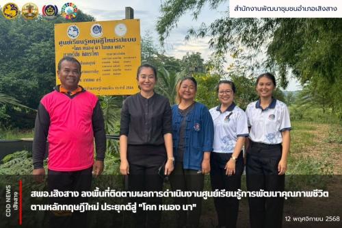 สำนักงานพัฒนาชุมชนอำเภอเสิงสาง นำโดยนางสาววลัยพร สมศักดิ์ พัฒนาการอำเภอเสิงสาง พร้อมด้วย เจ้าหน้าที่พัฒนาชุมชน และนางเรไร เปี่ยมไธสง ผู้นำอช. ลงพื้นที่ติดตามผลการดำเนินการศูนย์เรียนรู้การพัฒนาคุณภาพชีวิตตามหลักทฤษฎีใหม่ ประยุกต์สู่ "โคก หนอง นา" แปลง นายทวีชัย ทิศกระโทก หมู่ที่ 3 ตำบลโนนสมบูรณ์ เพื่อเป็นกำลังใจให้กับเจ้าของแปลง พร้อมรับฟังปัญหา อุปสรรคต่างๆ แลกเปลี่ยนแนวทางการแก้ไขปัญหา และแนวทางการพัฒนาร่วมกันกับเจ้าของแปลง